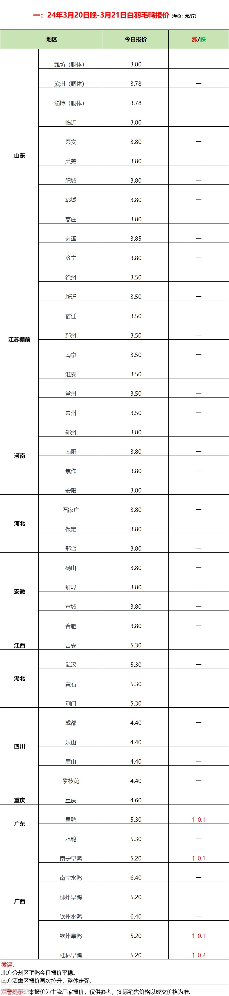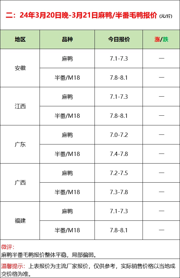 北方毛鸭持稳运行,市场供应平稳,屠宰以合同为主,对市场鸭支撑有限。南方活禽区旱鸭推涨开启,局部上行。