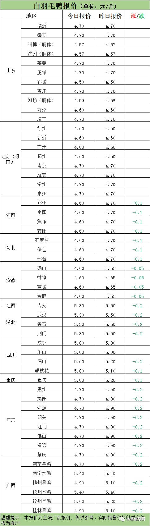 北方市场毛鸭报价弱,整体下行;北方主产区受疫情影响,冷藏开工不足,合同鸭拖杀普遍,市场鸭收购缩水,报价缺失较多,整体很弱。