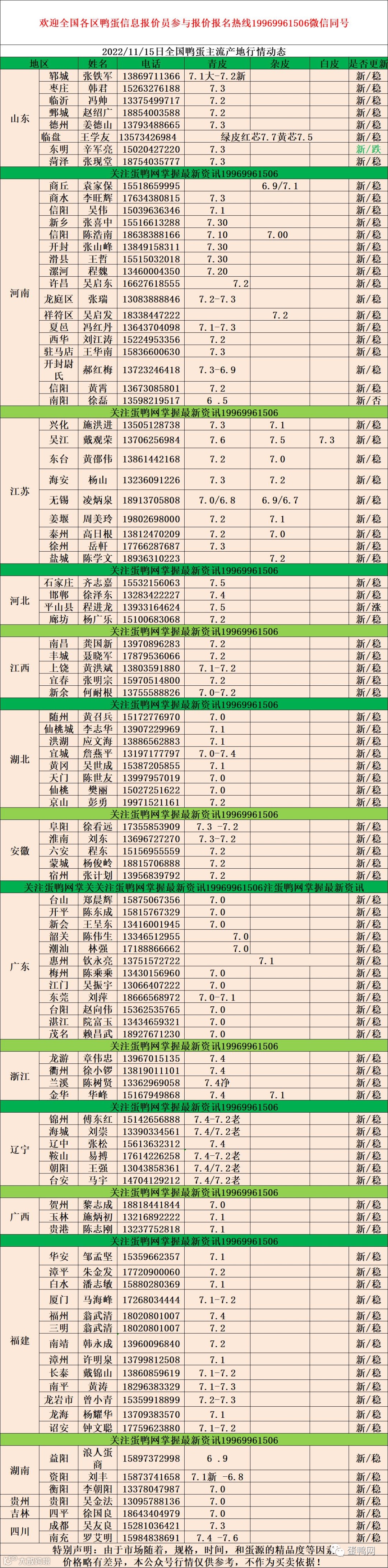 2022年11月15日:老鸭蛋7.2元,初产至10个头7元,10个头至大蛋7.4元。