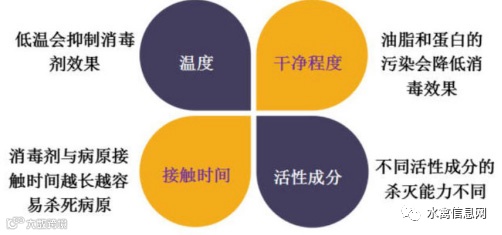 消毒剂使用时影响消毒效果的因素有很多,如消毒剂的有效成分、使用的方法、环境温度、干净程度、配比浓度、接触时间等。