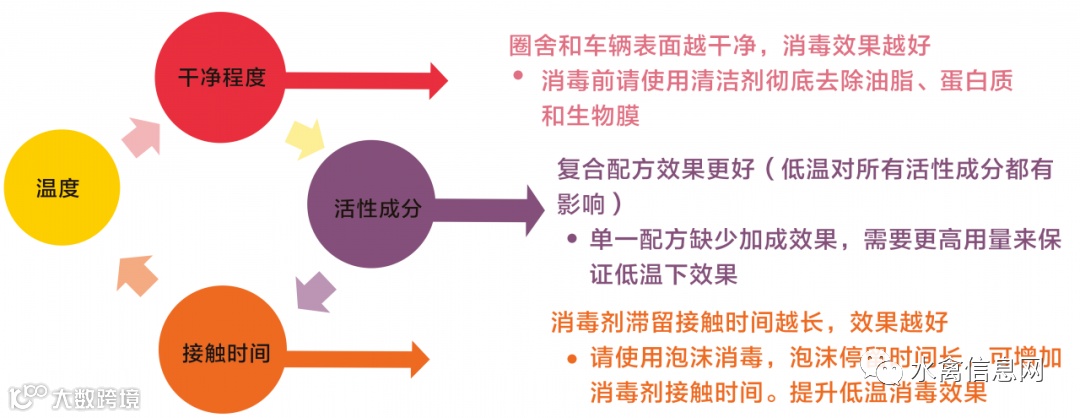 低温对消毒剂的作用(消毒剂+病原菌状态)影响很大,建议冬季养殖场的消毒选择在温度高的时间段进行,一般选择在上午10点至下午3点之间时进行消毒作业。