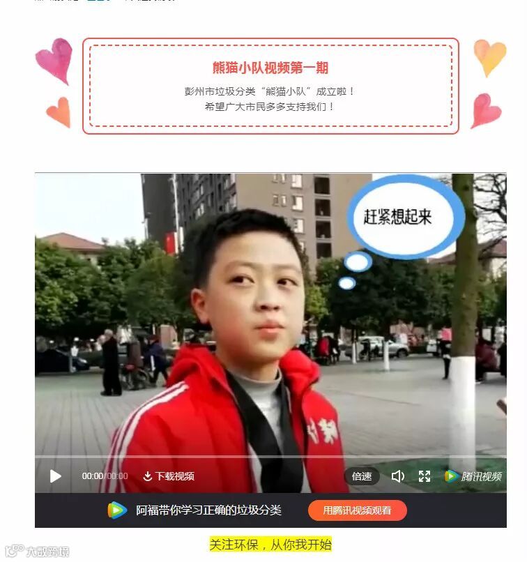 2018年12月成立了“熊猫小队”街访组,在彭州市进行随机采访,以自媒体方式向广大市民展示垃圾分类相关信息,截止本月熊猫小队已经发布三期视频啦!参与垃圾分类,下一期视频主角就是你!