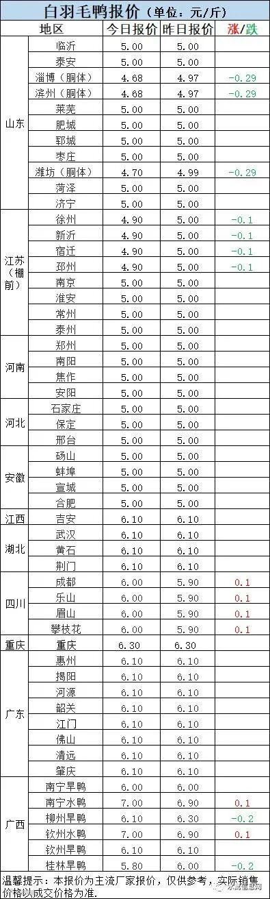 北方市场毛鸭报走弱格局,局部开始下调。南方活禽旱鸭走弱下滑,水鸭稳走略涨。