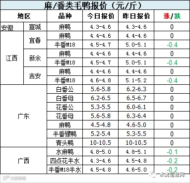 两广活禽连续下滑,养殖端深度亏损。受白鸭下滑影响,今晚麻鸭半番鸭报价持续弱势。