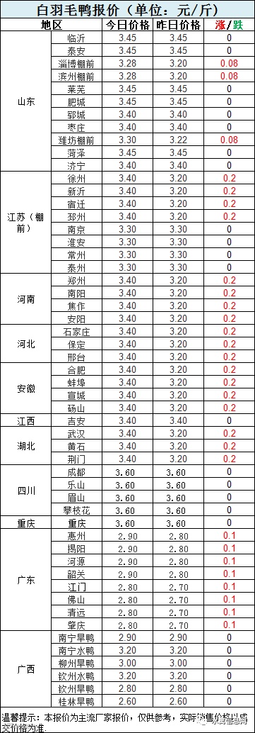 明日白鸭苗报价,两广下调0.2元/羽,其他区域暂稳。明日鸭苗报价供需双方分歧较大,局部区域高报低走,议价销售。