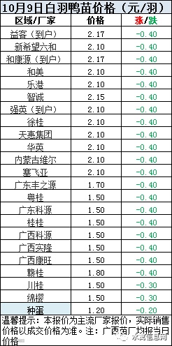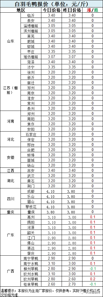明日鸭苗报价急转下滑,全国普遍下调0.3-0.4元/羽。