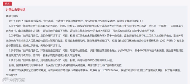 近日,有网友在人民网“领导留言板”留言,反映井冈山市龙市镇大庙村养猪场疑似违建问题。收到留言后,井冈山市委、市政府主要领导高度重视,要求相关单位立即核实处理。