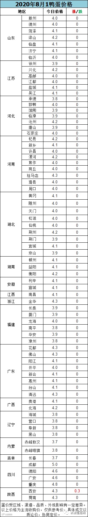 【鸭蛋价格】2020年7月31日鸭蛋报价,稳定为主。