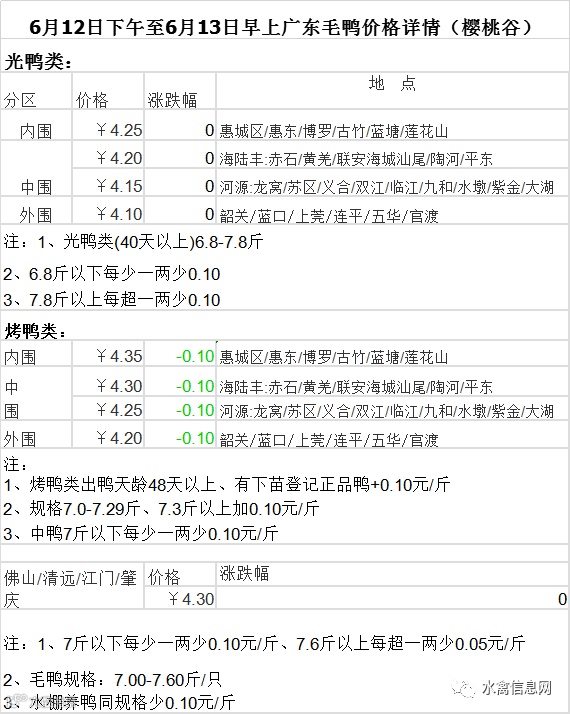 2020年6月12号下午至13号上午毛鸭报价