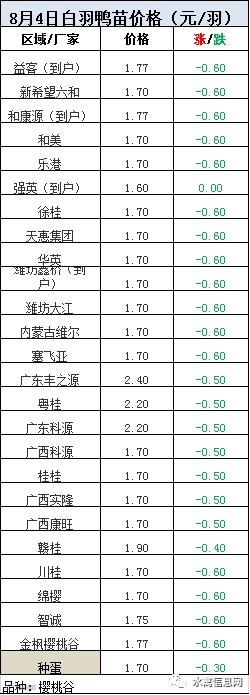 今晚樱桃谷毛鸭报价,北方报价稳定,山东今日局地回暖报涨。南方活禽两广局部继续高位下滑调整。【详细报价请查看下方表格】