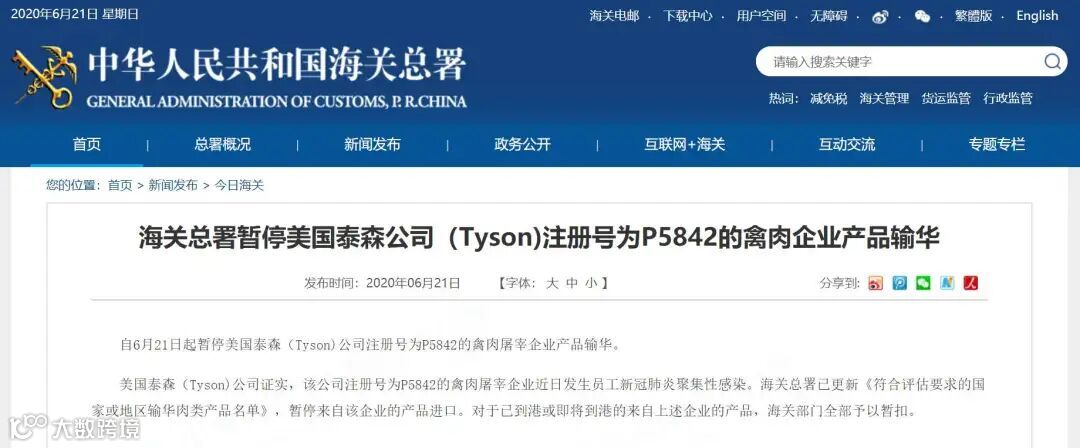 6月21日起,因近日发生员工新冠肺炎聚集性感染,暂停美国泰森(Tyson)公司注册号为P5842的禽肉屠宰企业产品输华。