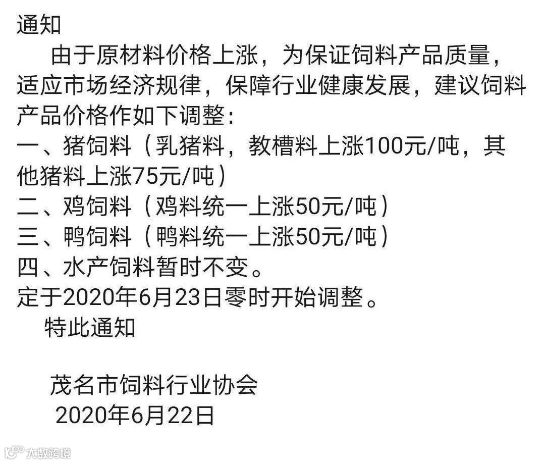 由于玉米价格的上涨,茂名猪禽饲料率先涨价,其中乳猪料涨价100元/吨,其他猪料涨75元/吨,禽料涨价50元/吨,水产料暂时不变。