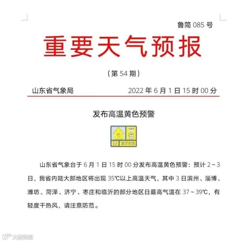 山东省气象台于6月1日15时发布高温黄色预警:预计2~3日,我省内陆大部地区将出现35℃以上高温天气,其中3日滨州、淄博、潍坊、菏泽、济宁、枣庄和临沂的部分地区日最高气温在37~39℃,有轻度干热风,请注意防范。