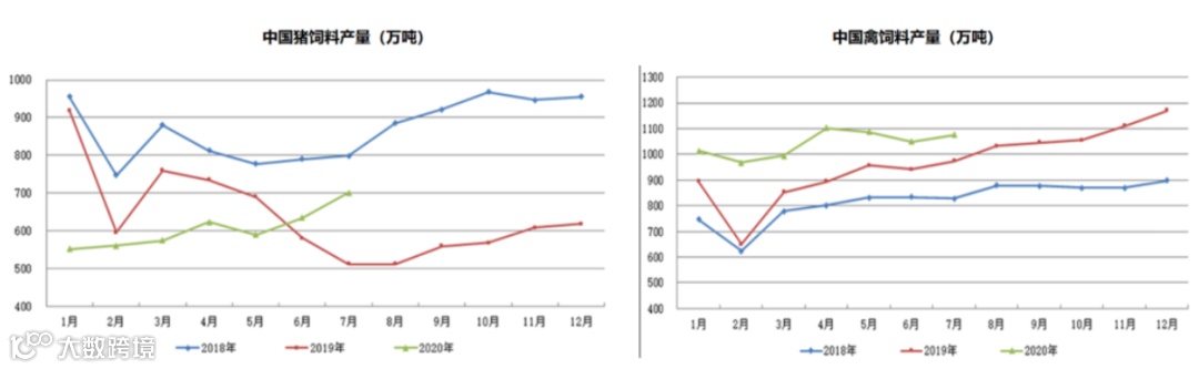 上述养殖数据也得到了饲料方面的验证。据饲料工业协会公布,2020年7月,饲料总产量2190万吨,环比增长7.3%,同比增长16.0%。7月饲料产量达近三年的高位水平,高于2017年以来的月度平均产量。从品种看,7月份猪饲料产量701万吨,环比增长10.3%,同比增长36.8%,连续2个月同比增长。其中,母猪饲料同比增长77.8%。肉禽饲料产量795万吨,环比增长2.7%,同比增幅9.6%。