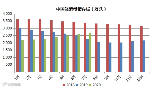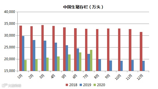 相比之下,生猪生产恢复的数据则更为抢眼。据农业农村部监测,7月份全国生猪存栏环比增长4.8%,连续6个月增长,同比增长13.1%。这是自2018年4月份以来生猪存栏首次实现同比增长,也是继6月份能繁母猪存栏同比增长后,生猪产能恢复的又一个重要拐点。同时,7月份能繁母猪存栏环比增长4.0%,连续10个月增长,同比增长20.3%。以此推算,7月末生猪存栏约2.4亿头,能繁母猪存栏约2700万头。