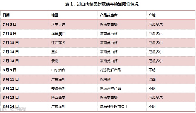 近期,进口冷冻肉制品外包装被检出新冠肺炎病毒的事件频发,根据官方通报,在冷冻生鲜产品外包装检出新冠病毒的9起通报中,有7省检测结果为阳性的样品均为厄瓜多尔进口南美白虾外包装或集装箱内壁,分别为安徽、云南、辽宁、福建、江西、重庆、陕西。广东深圳盒马鲜生员工被确诊的新闻,更是让公众对进口冷冻食品的安全性疑虑达到了一个高潮。