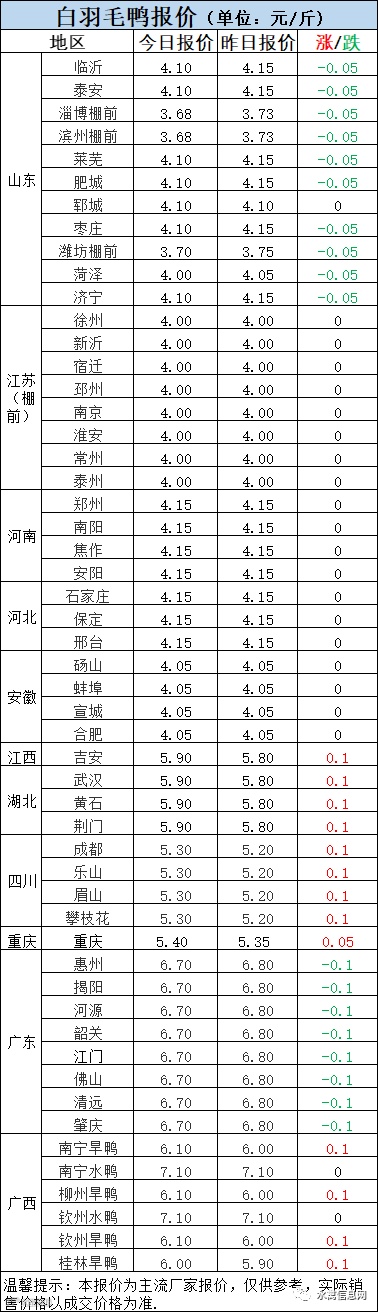 明日鸭苗报价,继续下滑0.1-0.3元不等。北方合同区域,对当前苗价接受度开始降低,合同厂家连续限价,鸭苗被迫下滑。