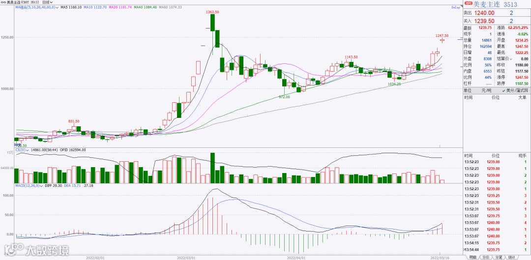 一系列突发事件冲击下,国际小麦价格一路飙涨,5月16日,美国小麦期货涨停,所有未来月份期货价格都已创出新高。