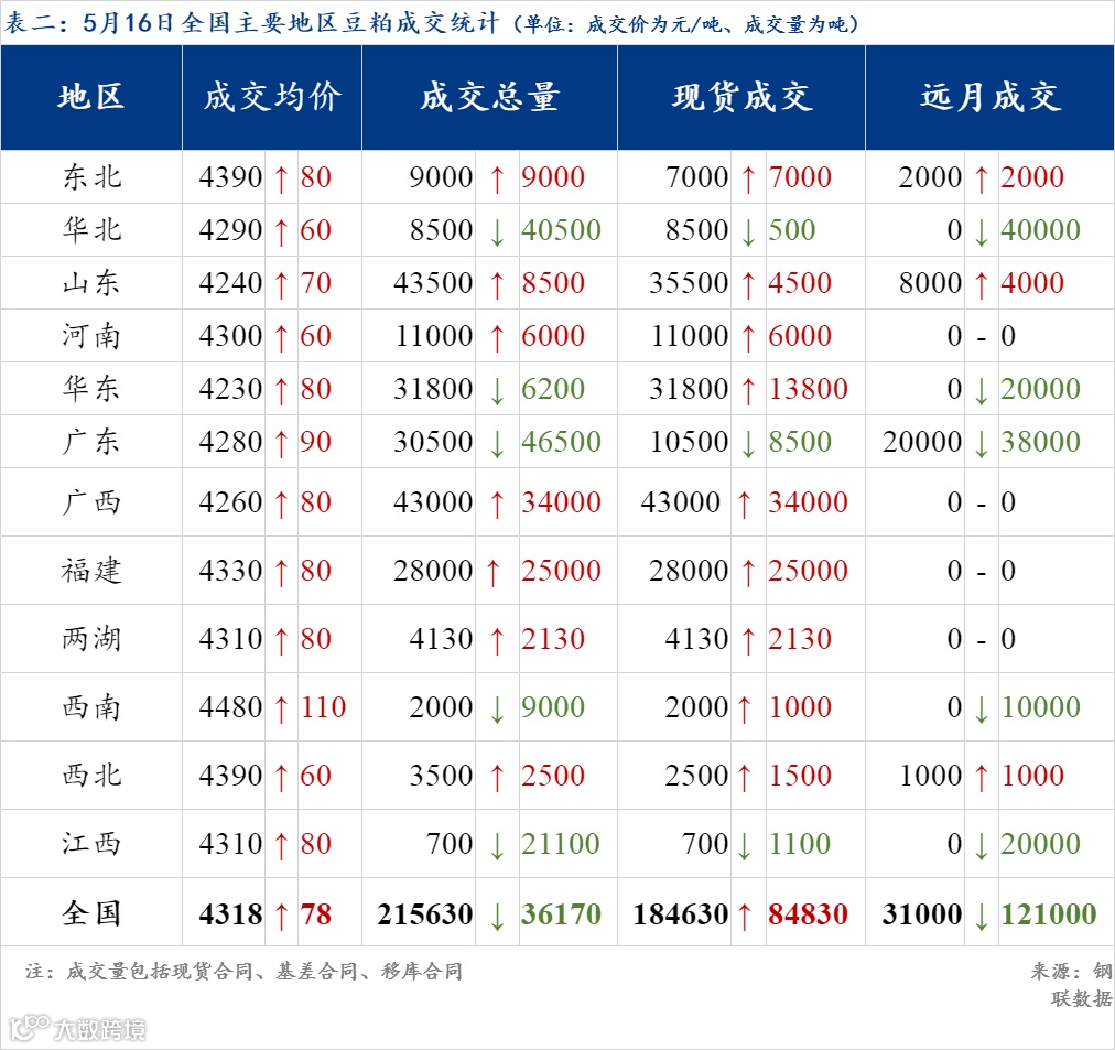 现货方面,16日油厂豆粕报价较上周五(13日)上涨60-100元/吨,其中沿海区域油厂主流报价在4260-4310元/吨,广东4320涨100元/吨,江苏4260涨70元/吨,山东4260涨70元/吨,天津4310涨70元/吨。