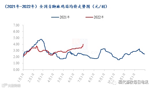 据Mysteel农产品数据统计,2022年上半年,全国青脚麻鸡苗均价2.99元/羽,较去年同期价格上涨,同比涨幅4.91%。元旦至春节前,青脚麻鸡苗的价格持续上行,养殖端看好后市行情,补栏情绪尚可,有补栏跨年鸡需求,叠加临近春节,企业停孵放假,市场苗量偏紧,毛鸡盈利尚可,养户投苗积极性高,苗价持续上行;春节后麻鸡行情持续低迷,饲料价格多次上涨,养殖端补栏消极,正常开孵后,企业抽毛蛋操作频繁,麻鸡苗价格下行,月底稍有反弹;3月中上旬,受新冠疫情的影响,交通运输限制较大,养殖端补栏积极性不佳,麻鸡苗价格稳中震荡调整,3月下旬起,毛鸡行情逐渐好转,3月底毛鸡价格大幅上涨,且疫情期间整体养殖端补栏较少,部分养户看好后市,补栏积极性提高,叠加企业为减少亏损,逐步淘汰老龄种鸡,市场出苗量小幅收紧,供需双向利好;第二季度,麻鸡苗价格整体上行且突破近三年的高位,节假期相对较多,需求端提振麻鸡价格,麻鸡苗价格也随之上涨;5月中旬起,市场鸡源紧缺,麻鸡价格上涨幅度较大,养殖户上孵积极性较高,6月份开始补栏,对应中秋节之前毛鸡出栏,毛鸡需求端支撑苗价,养殖盈利颇丰,养殖户看好后市,鸡苗价格上涨幅度较大。