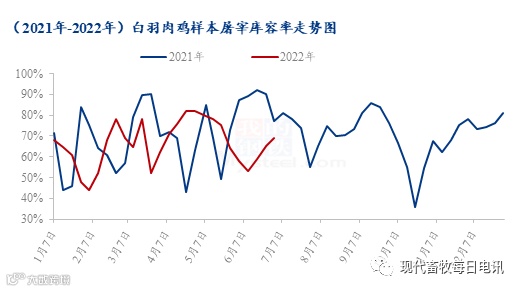 2022年1-6月份,全国白羽肉鸡样本屠宰企业库容率均值为66.97%,环比涨幅6.17%,同比跌幅7.35%。第一季度由于跨越春节,屠宰企业存在抛货折现,带动整体平均库位处于偏低水平。第二季度,新冠疫情的复发打击终端消费,屠宰企业长期走货不佳,经销商多以观望态度为主,随用随采,造成屠宰企业库存压力较大;期间上海、北京等市场的解封刺激部短期消费上行,下拉库位;且东北地区为代表的部分区域鸡源不足,开工长期偏低,也限制整体库容上涨。总体来说上半年库位虽有阶段性压力,平均库容较去年同期存在下滑。