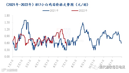 1-6月份817鸡苗均价0.78元/羽,环比跌幅-8.24%,同比涨幅6.85%。1月11日 817鸡苗跌至年内低点0.4元/羽,后因孵化企业抽珠子现象增多,养殖端补栏跨年鸡较积极,市场苗量供不应求,后期鸡苗价格触底反弹;3月份以后新冠疫情,交通受阻,鸡苗市场交投不畅,供需两弱,鸡苗市场供应短缺,供需博弈加剧;6 月 13 日涨至 1.20 元/羽,到达今年年内高位,价格高位主要是因为鸡苗实际供应量不多,量少支撑鸡苗价格上涨,之后开启下行通道,走势与去年同期走势相似。