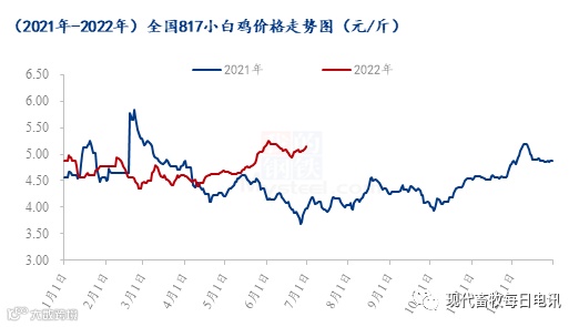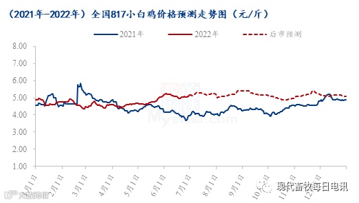 根据Mysteel农产品数据监测,预计下半年整体价格高于上半年,供应端从出苗量来看,817小白鸡出栏量后期增幅有限,饲料价格或上涨,养殖成本高位,817小白鸡价格难以大幅下跌;需求端,新冠疫情管控较上半年有所好转,按往年来看下半年肉禽类消费好于上半年,7月小白鸡价格看稳,8月底至中秋节前、9月底至国庆节前或有一波节日利好提振,带动817小白鸡价格上涨。10月底至11月,肉类进入消费旺季,毛鸡价格或有一波小幅上涨后无利好支撑,价格再次小幅下滑。12月份小白鸡价格以稳为主,区间震荡。