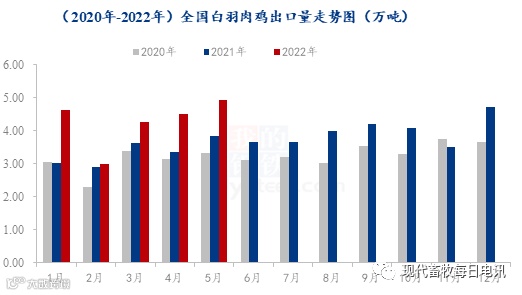 2022年1-5月份,全国鸡肉产品出口总量21.35万吨,同比增幅27.28%。2022年1-5月份出口总量为近六年的最高值。其中出口国或出口地区占比方面,日本和香港占比出口量前两位,出口日本8.14万吨,占比38.09%,出口香港6.24万吨,占比29.20%。出口以近距离的东亚、东南亚国家和地区为主。今年涨幅明显的出口量,一方面一定程度延缓了当前白羽肉鸡去产能的进度,另一方面也对国内白羽肉鸡的食品安全质量提出了更高要求。