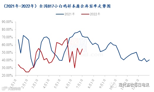1-6月份全国817小白鸡样本屠宰库容在44.37%,环比下调7.9个百分点,同比下调14.3个百分点。临近年底屠企抛货折现情绪浓烈,受库存高位影响,企业较往年提前停工,产品销售压力较大。整体走货速度偏弱,企业库存缓步走低。受新冠疫情影响,产品终端消费疲弱,3月下半旬价格持续上涨,出现倒挂现象,经销商拿货情绪开始走低。受交通运输不便影响,走货速度缓慢,库存量大。第二季度屠宰企业产能下降,开工不足,另一方面小白鸡价格过高,屠宰企业多按需宰杀,库存量相对减少,后期受产品价格上调影响,终端走货速度减慢,经销商拿货积极性降低,库存量小幅上涨。
