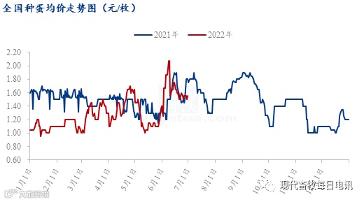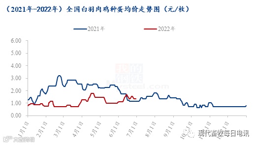 据Mysteel农产品数据统计,2022年上半年,全国白羽肉鸡种蛋均价1.08元/枚,较去年同期价格下滑1.06元/枚,同比跌幅49.53%。第一季度,受鸡苗价格持续低位的影响,种蛋价格低位震荡调整为主;自3月底开始至4月下旬,随着新冠疫情陆续解封,毛鸡、鸡苗价格上调,种禽及孵化企业上孵积极性提升,种蛋计划增加,种蛋价格上行至高位;4月下旬至5月上旬,鸡苗价格下滑后趋稳,种蛋价格有价无市,实际成交困难,蛋价顺势回调后稳定;5月中下旬至6月初,种禽及孵化企业规避 6 月份传统淡季心态较浓,企业上孵积极性不高,市场种蛋需求薄弱,种蛋价格低位持稳运行;6中上旬受毛鸡、鸡苗价格上涨至高位的影响,种蛋市场交投较好,孵化企业上孵积极性较高,甚至出现“抢蛋”现象,蛋价稳中上调;6月中下旬,虽孵化企业有集中上孵的情况出现,但市场抵触“高价蛋”,叠加鸡苗价格行情下滑趋势明显,蛋价区间震荡下行调整为主。