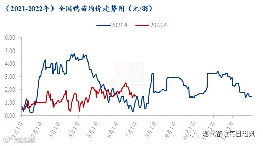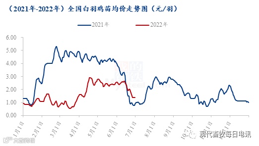 2季度,全国白羽鸡苗季度均价2.26元/羽,较1季度涨幅126%,本季度鸡苗价格整体呈先涨后跌趋势。其中,4月份,全国白羽鸡苗均价2.17元/羽,环比涨幅143.82%,同比跌幅51.35%;5月份,白羽肉鸡鸡苗均价2.46元/羽,环比涨幅13.36%,同比跌幅41.43%;6月份,白羽鸡苗均价2.14元/羽,环比跌幅13.00%,同比跌幅4.89%。第2季度,首先,因新冠疫情影响导致的交通管控逐步恢复,鸡苗运输得到缓解,叠加毛鸡价格连涨至高位,且饲料价格稍有下行,养殖盈利好转,养殖端上鸡积极性提升,种禽企业走苗计划加快,且受前期减量影响,市场整体出苗量不大,部分市场出现抢苗现象,鸡苗价格随之上行;其次,6月下旬开始,白羽鸡苗进入传统淡季,苗价下行趋势明显,毛鸡价格区间震荡调整,叠加高温天气影响,养殖难度较大,养殖端规避高温心态较浓,补栏积极性偏弱,种禽企业排苗计划不佳,多家企业鸡苗价格呈现高报低走,且市场鸡苗漏排计划较多,部分市场出现鸡苗“转817”、“抽毛蛋”现象,鸡苗成交价格混乱,鸡苗价格下滑至低位。