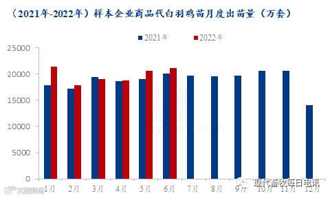 2季度,商品代白羽鸡苗出苗量较1季度出苗量增量2363.80万套,增幅4.06%;其中,4月份商品代出苗量18832.91万套,环比减幅0.86%,同比增幅1.34%;5月份商品代出苗量20648.59万套,环比增幅9.64%,同比增幅8.14%;6月份商品代出苗量21140万套,环比增幅2.38%,同比增幅5.43%。第2季度,受1季度新冠疫情影响,交通管制严格,前期企业种蛋上孵量不足,出苗量尚未完全恢复,导致4月份出苗量仍旧减量,但5、6月份因鸡苗价格的上涨,且毛鸡价格高位支撑,种禽企业排苗计划较快,种蛋上孵积极性较高,出苗量呈连续增量趋势。