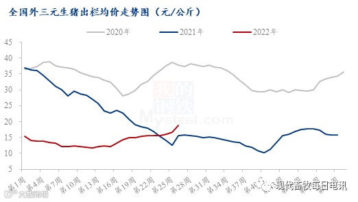 据Mysteel农产品数据调研显示,2022年上半年生猪出栏均价呈现跌后反弹的走势,当前价格重心明显上移。今年伊始,猪价由15.39元/公斤跌至最低点11.53元/公斤,整个一季度外三元生猪出栏均价呈偏弱下行走势,期间虽有涨跌调整,但大体维持偏弱窄幅震荡。不过自4月13日起,随着广东屠宰用猪禁调政策出炉,这也成为新一轮猪价上涨导火索,下半旬猪价由12元附近冲高至15元大关。到了5月中旬,北方猪价因规模场控量、猪源紧缺再度拉涨,推动全国猪价再次全面上涨。随着市场猪源有效供应缩减,猪价几度大幅拉涨,截止6月30日,全国外三元生猪出栏均价为20.27元/公斤,环比上涨29.52%,同比上涨27.08%。