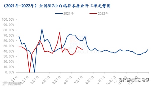 1月-6月,全国817小白鸡样本屠宰开工在42.92%,环比上调1.78个百分点,同比下调10.57个百分点。1 月整体出栏毛鸡不足,且临近春节屠企库存偏高,抛货折现操作频繁,宰杀意愿不足。2月春节假期屠企处于放假状态,开工均值偏低。3 月进入断档期后,受鸡源不足的限制,叠加新冠疫情造成的交通管制,屠企普遍安排不同程度休班计划,开工率开始走低。4月以市场和合同为主的屠企,因为断档期内毛鸡供应严重不足,屠宰不同程度放假计划。5月月初正值五一,屠宰企业陆续放假,开工率下降,后因小白鸡价格上涨迅速,屠宰企业成本增加,加上新冠疫情反复及行情低迷,终端消费能力弱,经销商拿货谨慎,屠宰企业竞争压力大,陷入两难境地,大部分屠宰企业间歇性开工。6月开工率处于低位,总体还是受鸡源供给量少、价格过高的影响,部分屠宰企业陷入亏损,难以开工,多处于间歇性开工状态。