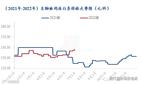 2022年上半年青脚麻鸡冻白条价格整体变化幅度有限,两次高点分别出现在春节前和受新冠疫情影响补栏的第2季度末,全国上半年青脚麻鸡冻白条均价133.23元/件,环比上涨5.37%,同比走低3.03%。