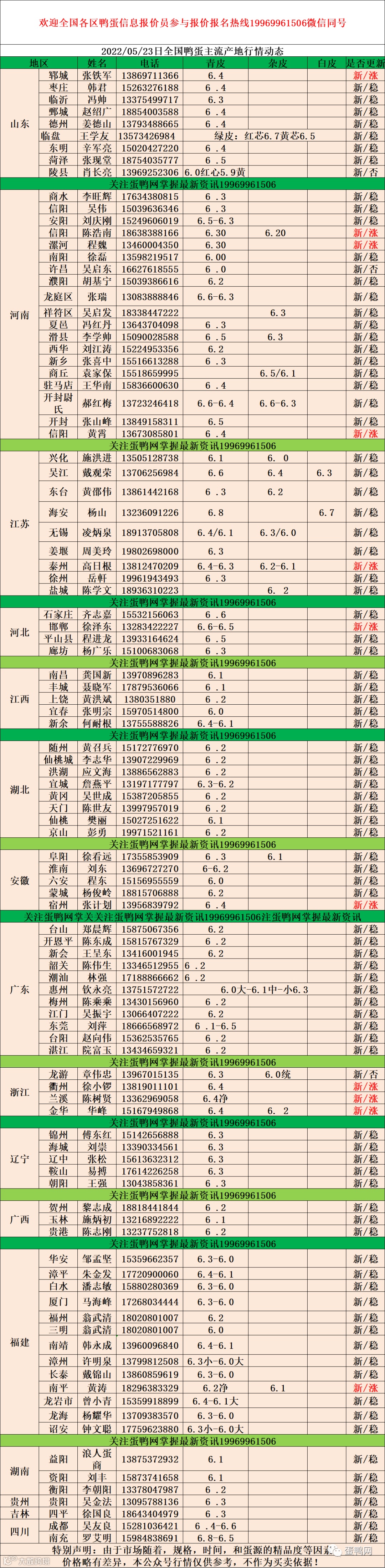导读:2022年05月23日鲜鸭蛋价格:初产至10个头6.1元,10个头至9个6.2元,9个头至大蛋6.3元(参考