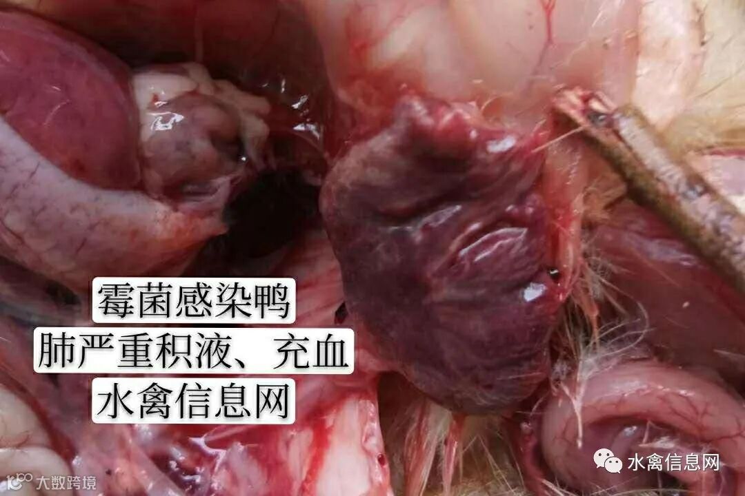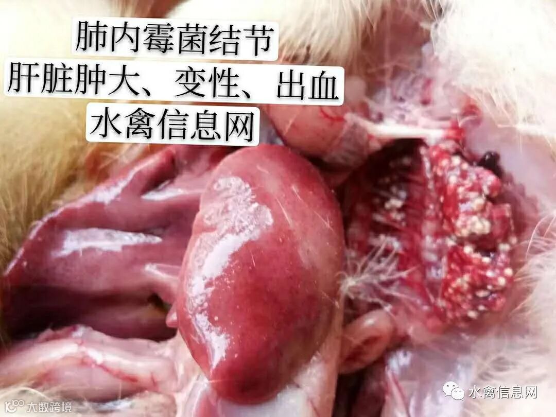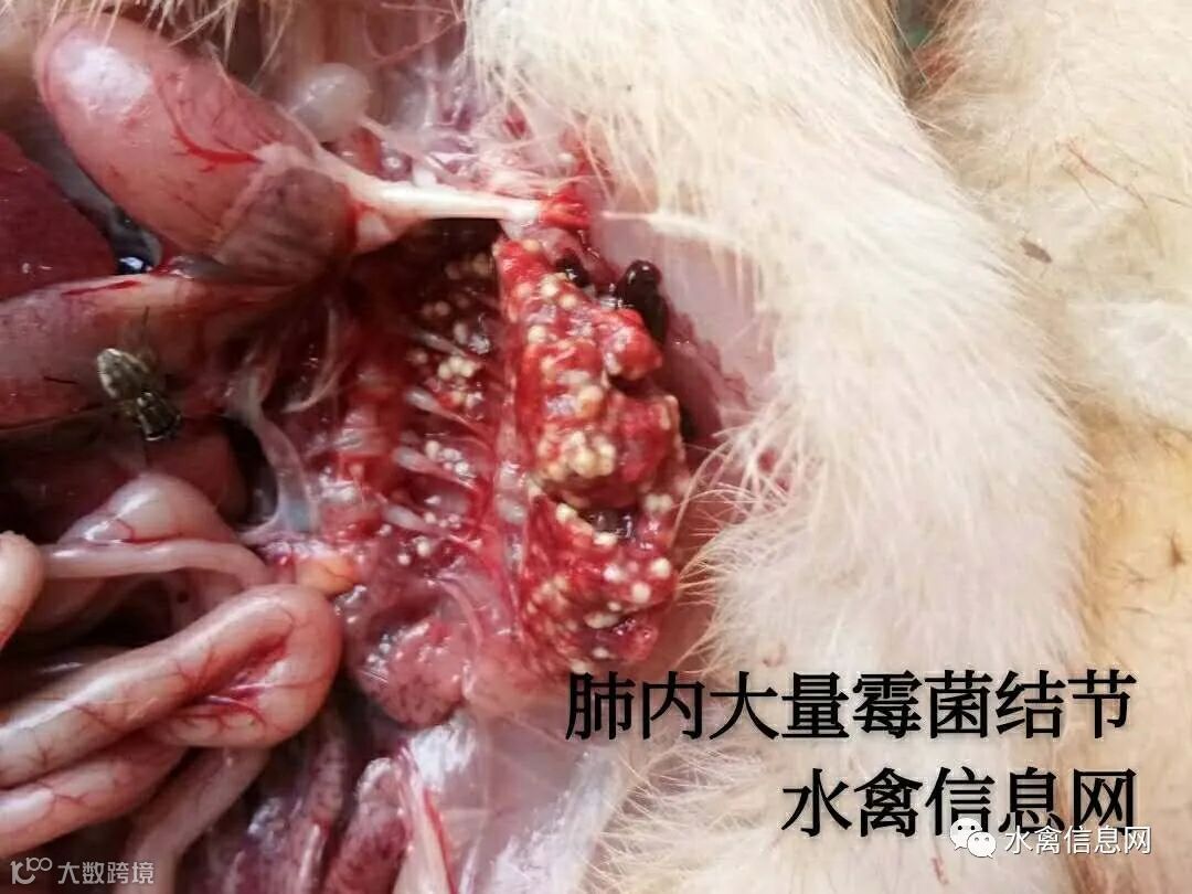 图一:霉菌大量在肺内下行支气管繁殖形成结节,堵塞肺及小支气管。导致鸭呼吸困难,伸脖喘气,有怪叫声。