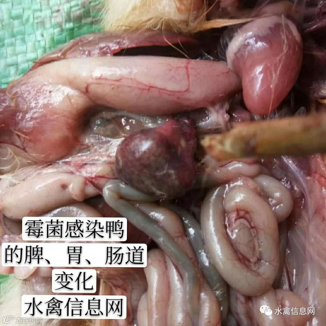 这家樱桃谷肉鸭,8日龄发病。地网养殖,养殖环境较差,空气污浊,地面潮湿,角落有明显霉菌繁殖迹象。病鸭呈坐地拔脖呼吸状,呼吸困难,大群采食量减少,粪便较稀。通过养殖环境观察结合解剖状况诊断为霉菌引起肺炎,及并发症脾坏死、腺肌胃炎。建议养殖户:改善养殖环境,投放抑杀霉菌药品及霉菌毒素降解产品(澳饲特+益牧雏宝),同时结合大群情况及时淘汰病残鸭。