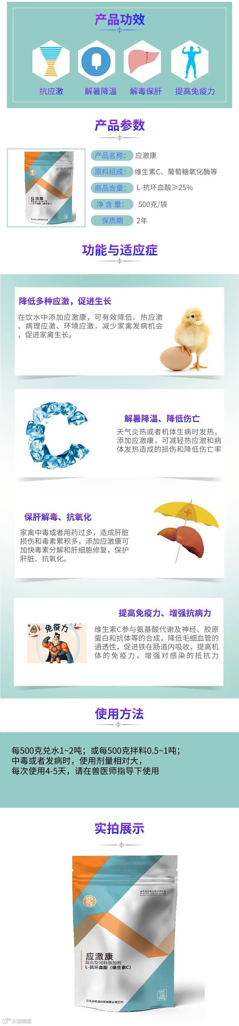我们的【应激康】就是专门针对于夏季高温应激设计,添加不易氧化分解的包被vc,及开窍醒脑的薄荷提取物与冰片,还额外添加解内热疏肝保肝的牛磺酸与葡萄糖氧化酶。抗热应激,缓解内脏负担效果显著。