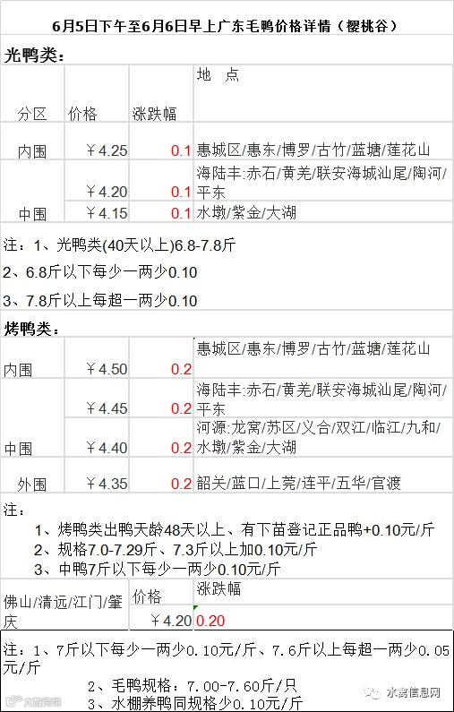 2020年6月5日下午至6日上午毛鸭报价