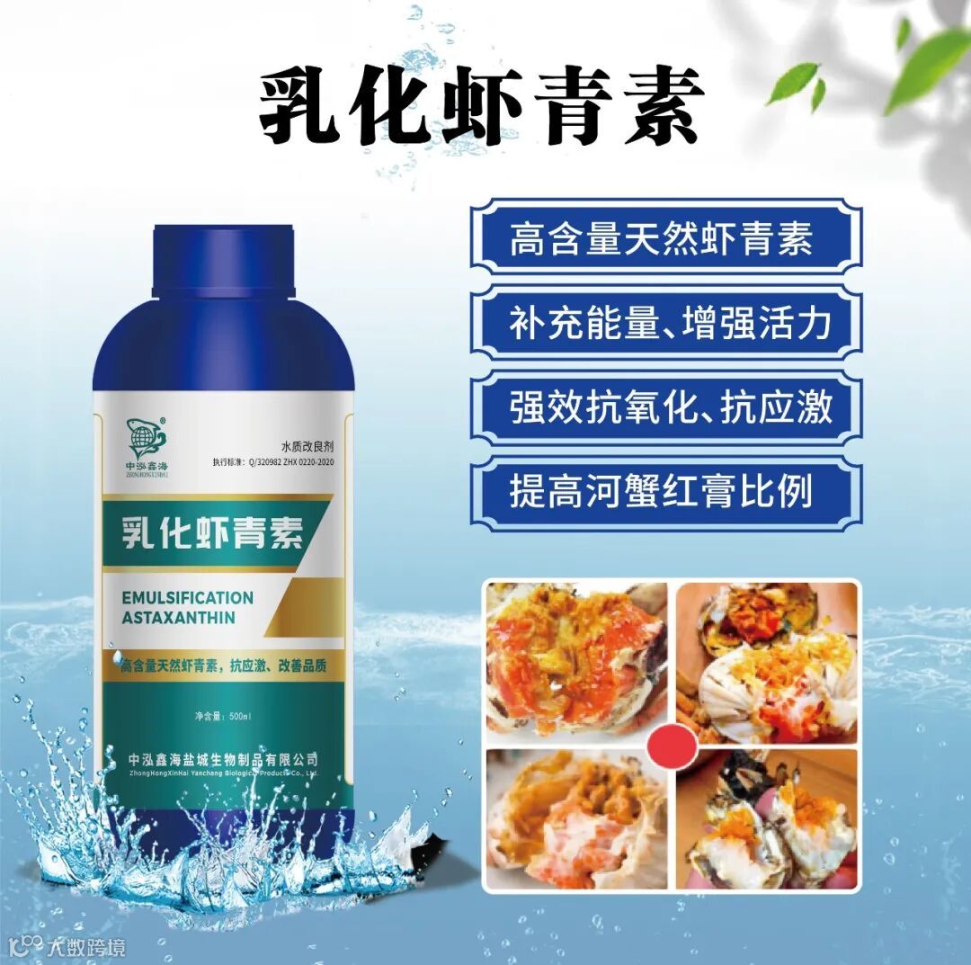 (4)营养保健:定期补充虾青素可以有效提升螃蟹抗应激能力,增强体质,增加河蟹摄食量。在投喂饲料的时候配合“乳化虾青素”拌料(80kg料),能够有效促进河蟹育肥红膏。