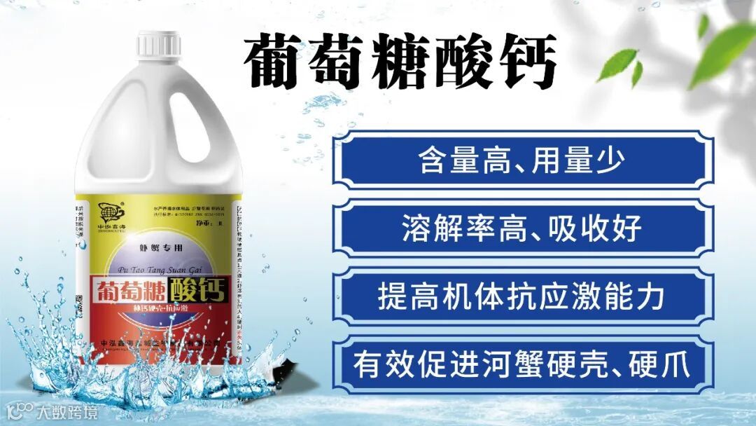 河蟹蜕壳补钙首选离子钙,如“葡萄糖酸钙”,不仅钙含量高,还同时含有多种营养素与抗应激因子,精细工艺自主熬制,溶解性好,生物利用率高,增强抵抗力,快速促进河蟹硬壳,争取捕获上市时机。