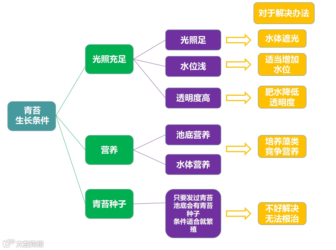 分析:把水体表面的青苔捞掉之后,但是其孢子还大量存在于池底,水温适宜和光照充足时依然会疯长。