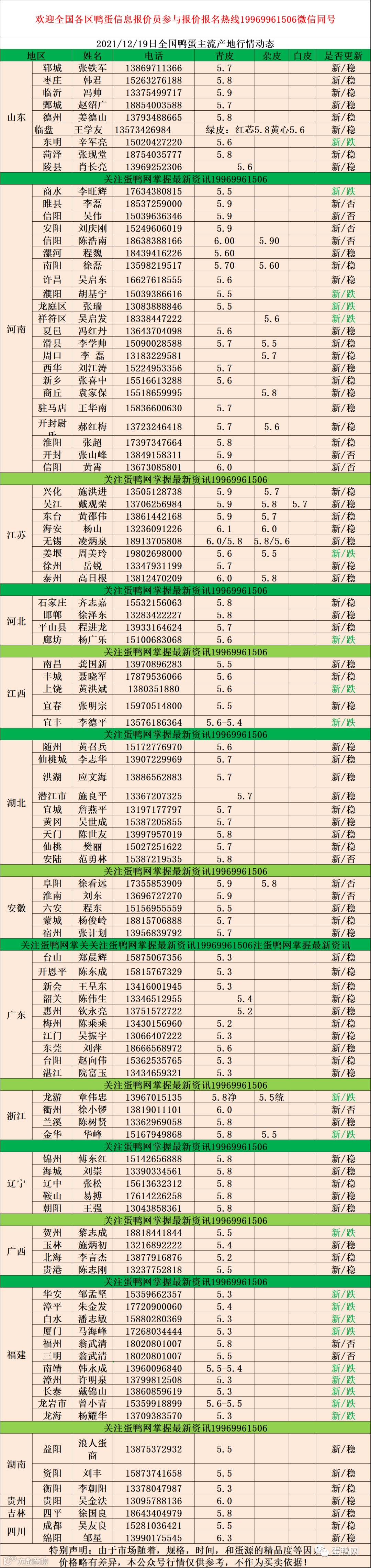 2021年12月19日鲜鸭蛋价格:初产至10个头5.0元 。 10个头至9个5.2元。9个至8个5.4元。8个至7个半5.6元,7个半至7个头5.7.元足7个头5.8元(鸭蛋价格仅供参考)。