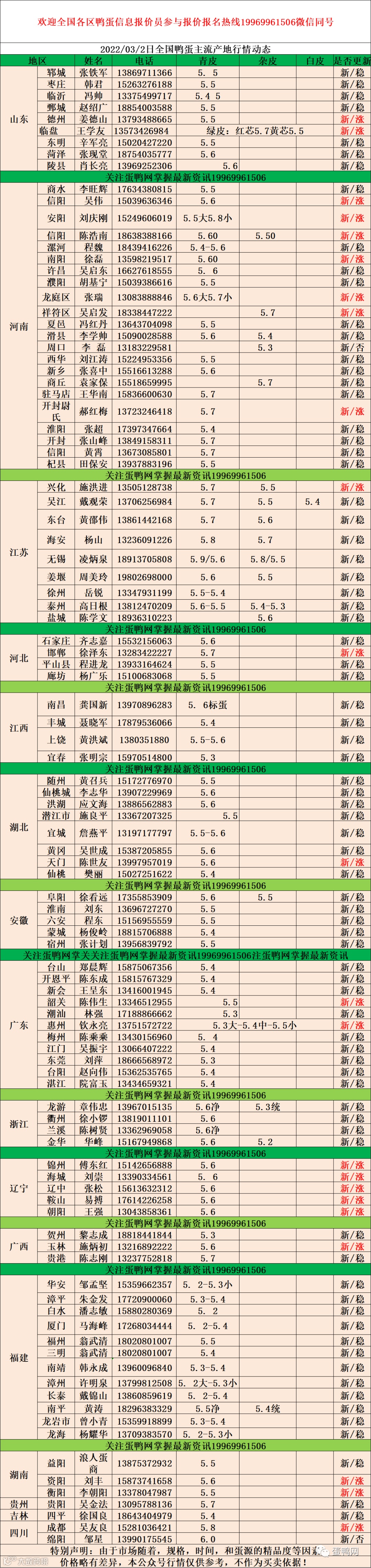 2022年03月2日鲜鸭蛋价格:初产至10个头5.2元 。 10个头至9个5.4元。9个头至大蛋5.6元(鸭蛋价格仅供参考)。