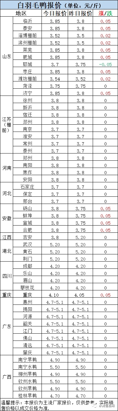 今晚北方毛鸭报价整体上涨。毛鸭略有走强主要来源于成本压力,但综合来看上涨幅度有限。