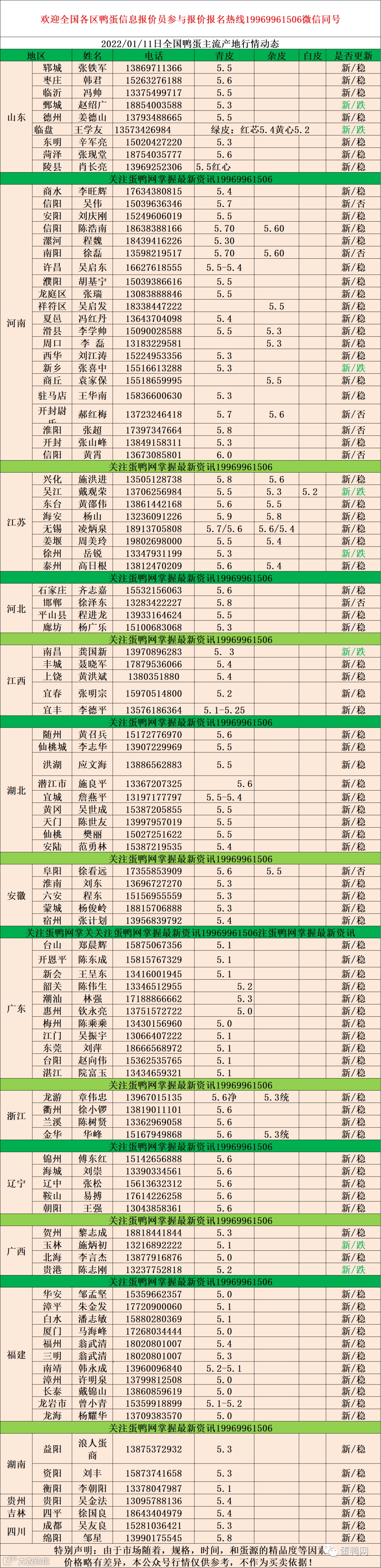 2022年01月11日鲜鸭蛋价格:初产至10个头5.0元 。 10个头至9个5.2元。9个至7个半5.4元。7个半至7个头5.5元,足7个头5.6元(鸭蛋价格仅供参考)。