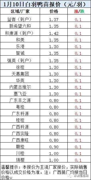 一、2022年1月10日白羽鸭苗报价