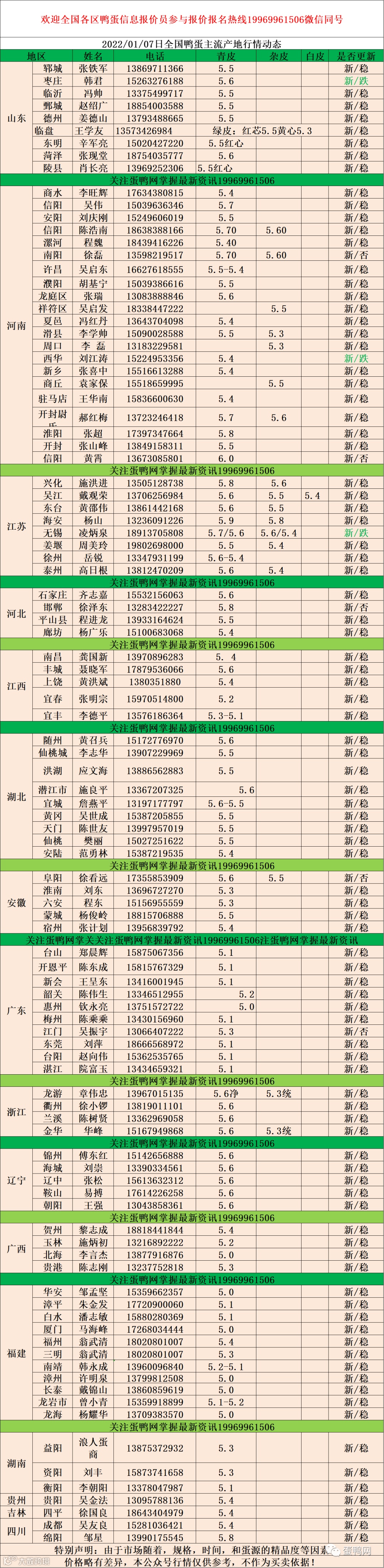 2022年01月07日鲜鸭蛋价格:初产至10个头5.0元 。 10个头至9个5.2元。9个至7个半5.4元。7个半至7个头5.5元,足7个头5.6元(鸭蛋价格仅供参考)。