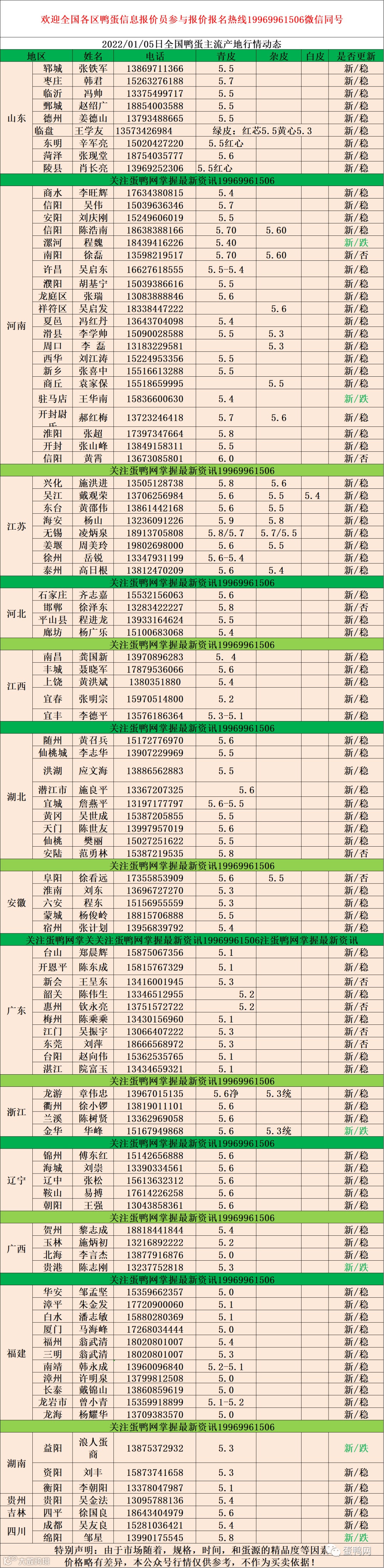 2022年01月05日鲜鸭蛋价格:初产至10个头5.0元 。 10个头至9个5.2元。9个至7个半5.4元。7个半至7个头5.5元,足7个头5.6元(鸭蛋价格仅供参考)。
